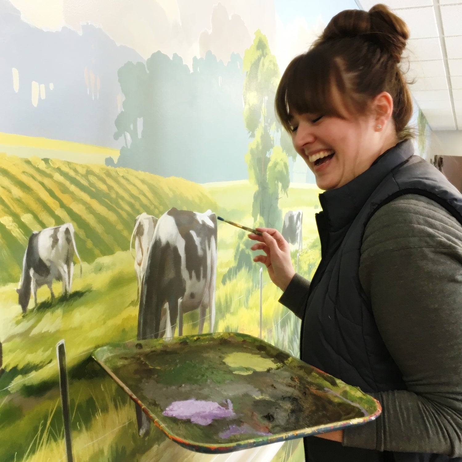 I came to the art world a little differently than most. I trained as a theatrical Scenic Artist and cut my teeth on translating the visions of designers onto large-scale fabric backdrops for live theatre. I’ve used those skills to fuel a career as a muralist, painting wall-sized images of my own creation for businesses and organizations.